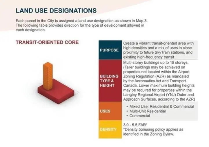 This Property is designated "Mixed Use Residential" which will allow a FAR of 2.5-3.5 due to potential density bonusing provisions in the OCF Bylaw Building height can be a maximum of 12 stories.Mixed use residential allows for ground floor commercial and residential above. See included draft plan renderings for both a 6 story and 12 story building on this assembled side. Three parcels must be purchased together and total nearly 1/2 acre. (20755 Douglas Crescent, 20765 Douglas Crescent and 545