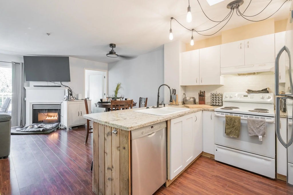 Penthouse beauty! Almost 700sf 1 bdrm 1 bthrm PLUS den style north facing home. 2 skylights. Great room concept with your kitchen overlooking your dng and lvg rm. Kitchen has a breakfast bar, lots of cabinets and granite countertops. Livingroom has a gas f/p and access to your private deck. Primary bedroom has a wi closet + another closet, cheater ensuite w/has an oversized shower w/tile surround & granite c/tops. The den has sliders to your balcony. Laundry area is huge and open w/cabinets & counterspace. Bright home on the quiet side of the building. 2 parking spots, 1 storage locker. Close to transit, shopping, restaurants, Willowbrook and more.