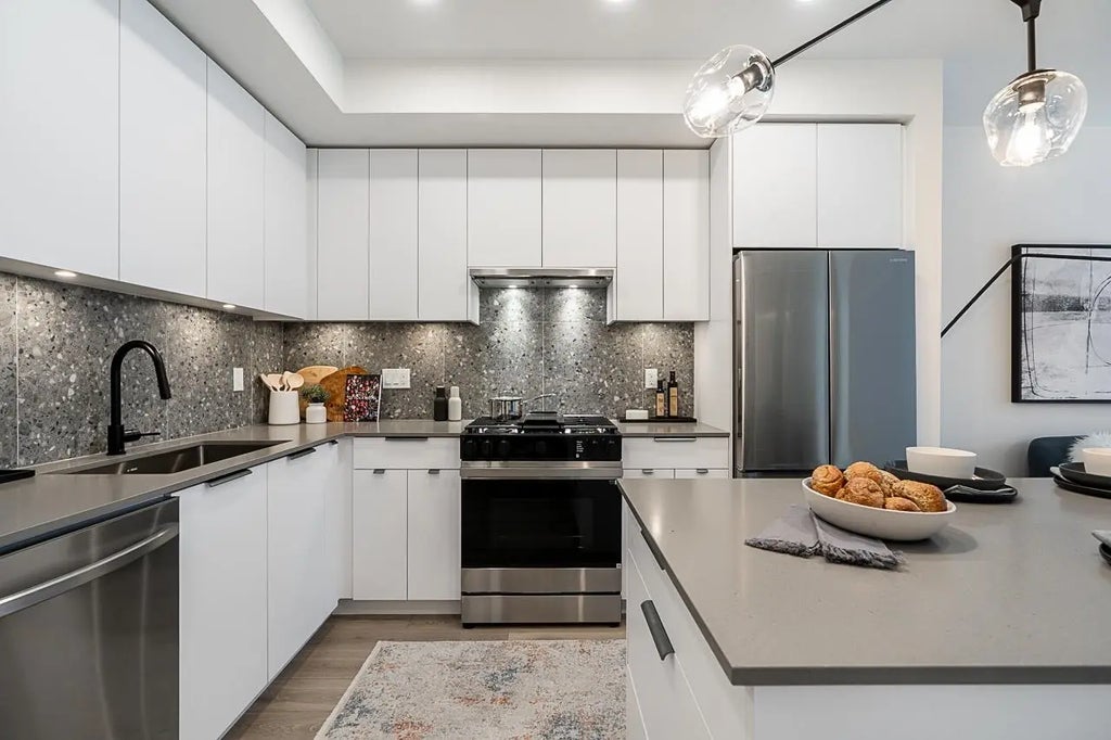 Brand new large, move-in ready 1 bed+ den home at Hive 2, North facing, built by award winner Apcon Group. Located in Willoughby Town Centre with restaurants, shopping, across the street from the indoor Tennis Centre and Elementary school. Shared amenities with fitness center, party room, co-working space and outdoor BBQ and play area. Inspired living built with high quality materials and modern design touches. Wide plank flooring in main living area and den, contemporary roller blinds filter natural light. Full size front stacking in-suite laundry, functional kitchen with full size stainless steel fridge, gas range and dishwasher. Beautiful bathroom with stylish hardware and undermount sink. Full 2/5/10 year new home warranty. One parking and one storage locker included.