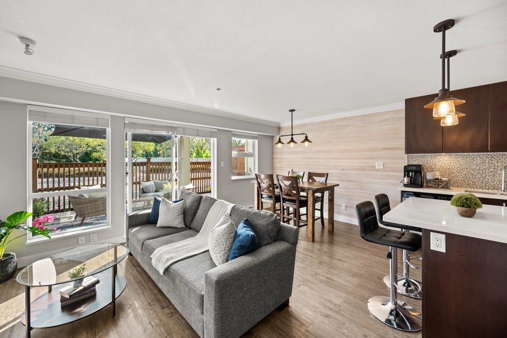 Amazing value for this stunning 1-bedroom and Den condo, with a rare spacious walk-out patio. This unit is located on the private side of the shops with tons of natural light and a nice view. Updates include a new fridge, beautiful wood details in the dining and bathroom and modern light fixtures added. There is durable and chic vinyl plank flooring, and the home is move-in ready. You can see the care and upkeep this home has had. It includes 1 storage locker and 1 parking. Additional parking is available. Enjoy the convenience of living in Morgan Crossing, an urban lifestyle with all the amenities close by. Pets allowed! OPEN HOUSE Sun Sep 28, 2-4pm