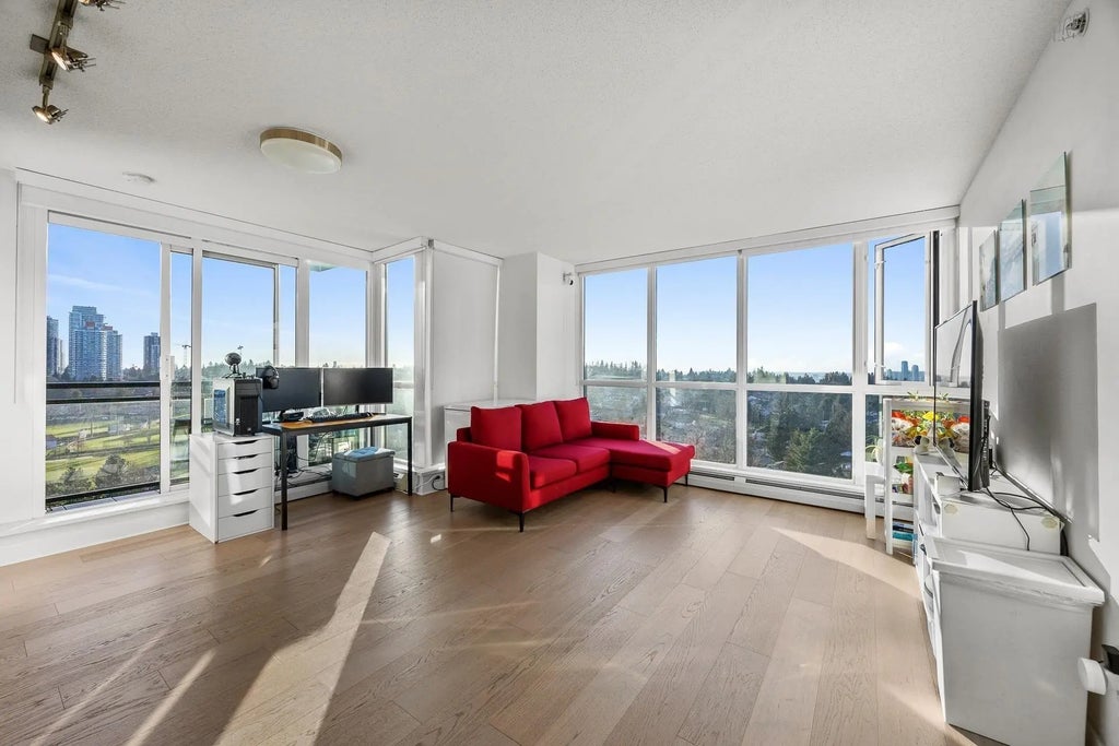 This upgraded 2-bedroom + 2 bath and den, southwest facing corner unit located in the heart of North Surrey. The open-concept, split-bedroom layout offers stunning views with mountain, city and green park. Features include quartz countertops, newer stainless steel appliances, new window coverings, engineered flooring throughout the living areas and full-size windows. 1 minute to Gateway Skytrain station. Walking distance to Surrey Central, SFU, restaurant and more! One parking and one locker. Strata fee includes heating, water, hot water etc.