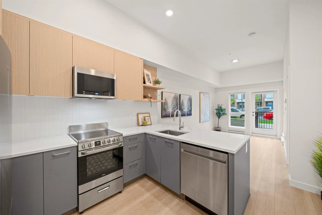 Virtually brand new! Phenomenal garden level home with SOARING high 10'7ft ceilings, a HUGE 170 sq.ft. private gated patio with additional SEPERATE entrance! Open concept 1 bedroom unit features an extremely efficient floorplan and high-end finishes throughout including beautiful quartz counter tops, engineered wide plan flooring, Energy Recovery Ventilation (ERV) for year round comfort/ air quality and MUCH, MUCH MORE! Q5 built by reputable developer Tien Sher features resort like amenities including a FULLY equipped gym, business centre, games room, shared garden space entertainment lounge, outdoor bbq area children's play zone and more. Centrally located close to shopping, amenities and steps to Gateway Skytrain, SFU. 1 parking and 1 storage.