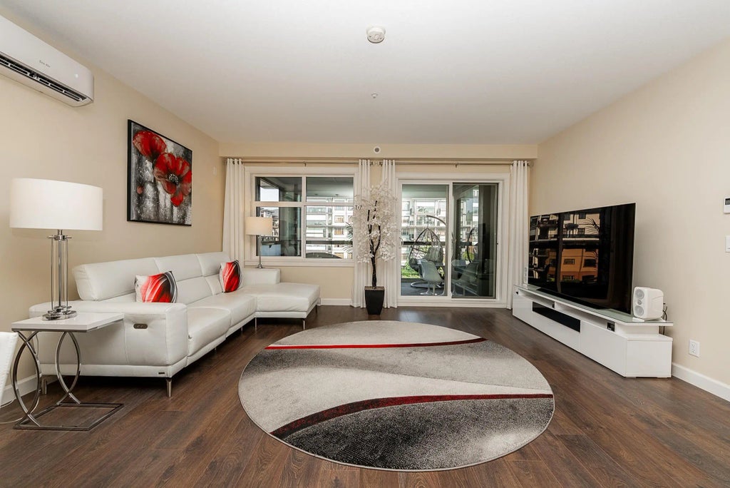 Immaculate and spacious East-facing 3 bedroom + den at sought-after Yorkson Park! Offering 1,583 sq ft of bright and air conditioned living space, plus a 225 sq ft solarium/balcony with retractable glass panels and courtyard views. The gourmet kitchen features a peninsula with seating, gas range and sleek cabinetry, seamlessly connecting to the dining and living area. Designed for year-round enjoyment, the solarium expands your living space. Generous bedrooms include two with luxurious ensuites, double vanities, frameless glass showers, walk-in closets, and access to the solarium. Added features include an energy-efficient heat pump with A/C, gas BBQ hookup, 2 parking stalls, and a storage locker. Conveniently located near Carvolth Exchange, shopping, restaurants, and quick highway access.