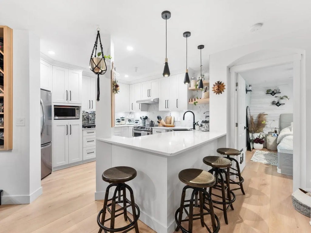 Absolutely gorgeous 1,151 sf, 2 bdrm, 2 bath extensively updated condo with high end renovations including gorgeous wide plank floors, tasteful décor, updated light fixtures, entertainment sized living rm with gas fireplace & door to patio, spacious dining rm with attractive built-ins, gorgeous updated kitchen w/white shaker style cabinets, SS appliances and quartz counters w/breakfast bar, 2 spacious bdrms & 2 extensively updated baths including primary bdrm w/wi closet & spectacular 4 pce ensuite. Fantastic floor plan with the 2 bdrms separated from each other by the living area provides the utmost in privacy. 2 parking stalls and storage locker are added value. Very spacious absolutely gorgeous updated condo with fantastic layout in prime Murrayville location absolutely must be seen.