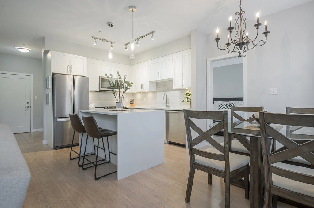 Rare 3 Bedroom ground floor unit in sought-after Elements! This spacious layout features an open-concept kitchen and living area filled with natural light, backing a private 40 ft patio and peaceful greenspace. Freshly painted with a light color scheme, quartz counters in kitchen and baths, and brand-new carpets throughout. Ideal layout with two bedrooms down the hall, separate from the Primary suite with double sinks and a large walk-in closet. Perfect for downsizers or single-level living. Includes in-suite storage, locker, and 2 parking. Walk to shops, dining, and more—quiet, tucked-away location!