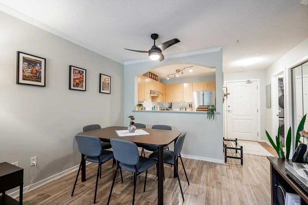 "MURRAY GREEN" This beautifully maintained and tastefully updated 2 Bdrm, 1 Bath home is located in the heart of Murrayville! Enjoy modern touches throughout, including updated laminate flooring, elegant crown moulding, brand-new S/S kitchen appliances, and a full-size washer & dryer. The bathroom has been refreshed with new tile flooring and a stylish vanity. Step out onto the spacious 149 sqft balcony, perfect for relaxing or entertaining while overlooking private greenery. The building offers fantastic amenities, including a guest suite, exercise room, and amenity room! Close to restaurants, coffee shops, grocery stores, W.C. Blair Rec Centre, the hospital, and nearby parks. Parking stall is the closest to the lobby door! 1 locker is also included!
