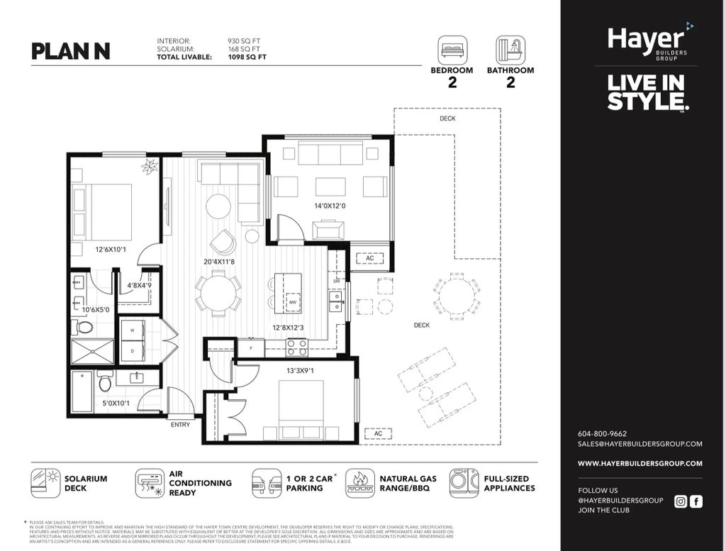 Very bright SE corner brand-new 2 bed/2 bath home featuring 930 sf interior + 168 sf enclosed solarium. Award-winning Hayer Town Centre offers stylish interiors with A/C upgrade, laminate flooring throughout (incl. bedrooms), modern closet organizers, blinds, full-size appliances, quartz counters, and gas range. Includes 2 parking stalls & storage. Enjoy hotel-style amenities: concierge, fire pits, vertical garden, outdoor courtyard, premium shops, dining, and fenced dog park. $50,000 Buyer Credit!