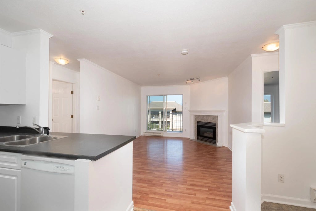 Imagine sipping your morning coffee, or evening glass of wine, on your private Mountain View balcony! Perfectly laid out 2 Bdrm, 2 Bath almost 1000sf top floor suite, and spacious Living & Dining room (or Den/Office?) provides tons of light and feeling of space. Open kitchen plus pantry/laundry area flow out through living rm with cozy gas F/P, to balcony. Freshly painted & new carpeted bdrms are a wonderful addition to easily allow your own creative style. Secure prime Parking & large Locker included too. Convenient Central location only steps to lots of great restaurants, shopping area, near Abernethy, West Coast Express, Haney bus exchange. Recreation Leisure Ctr/Seniors Activity Ctr steps away!