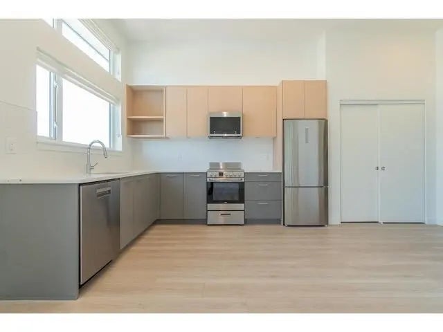 Bright top-floor corner unit with 10'6” ceilings, 780 sq. ft. of open living space, and huge windows offering mountain + city views (and a peek of the Fraser River!). 2 Bedrooms + 2 Full Bathrooms Designer kitchen w/ quartz counters & stainless steel appliances Wide plank flooring + LED lighting In-suite laundry 1 Parking stall + 1 Storage locker Building Amenities: Gym, party room, business center, fireside lounge, community garden, workshop, outdoor BBQ & playground.