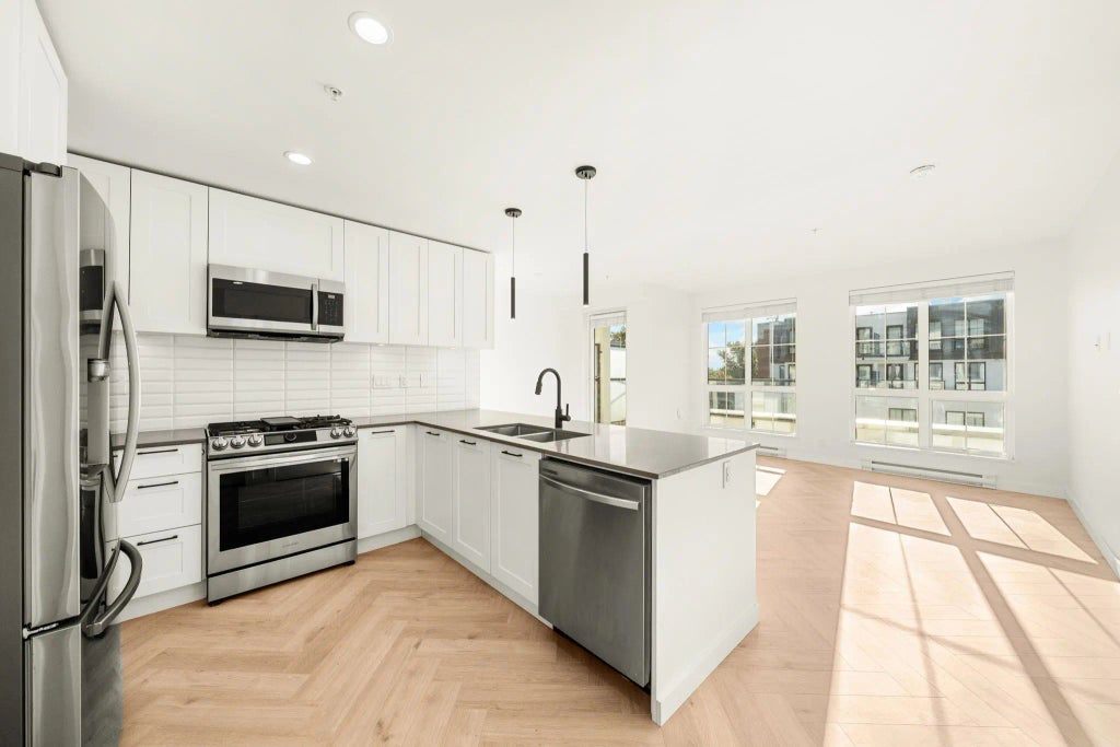 Experience luxury living with this 2 Bed, 2 Bath PLUS Den at Latimer Village by award-winning Vesta! 1,085 sqft, open concept floor plan boasts 9 foot ceilings, oversized windows, peninsula kitchen w/ upgraded S/S appliances, gas range + built in microwave. Primary suite w/ a HUGE walk in closet. This unit presents like NEW w/ recent upgrades such as full paint, brand new white oak HERRINGBONE WPC flooring, and new bathtub shower glass. 1 secure parking stall directly in front of your MASSIVE storage room customized w/ shelving. Located in Building Fis desirable w/ quick access to the ROOFTOP DECK which includes a putting green, kids play area, BBQ & community garden. Unit is vacant so quick possession is possible! Easy access to HWY1 & Carvolth Exchange. Rentals allowed. MUST SEE!