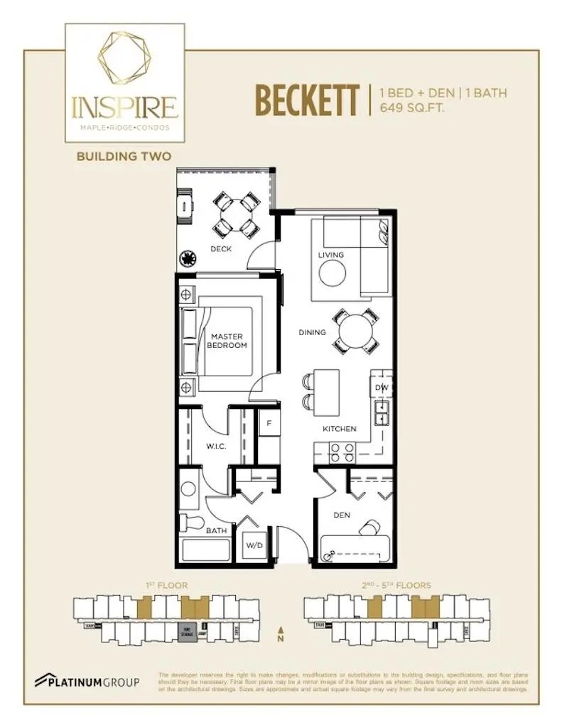 This Spacious 1 Bedroom with a Walk-in Closet | Den | 1 Bath, 649 sq. ft. condo in Inspire Phase 2. It is set to be completed in April 2026. Designed for modern living, it features 9' ceilings, stainless steel appliances, quartz countertops, cabinets, an island, and durable laminate plank flooring throughout, upgraded in the Bedroom! Additional touches include built-in closet organizers, underground parking, a spacious balcony and tons of amenities. Walking distance to restaurants, shops, schools, & grocery stores. Easy access to Hwy 7 and close to West Coast Express!